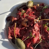 Вителло тонато су-вид с джемом из шитаке ( запеченное мясо говяжьей вырезки,нарезанное тонкими слайсами)