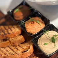 Ассорти паштетов(сырный,печеночный,томатный),подается на деревянной доске с чиабаттой