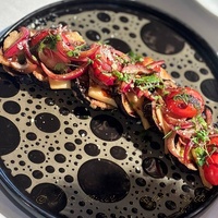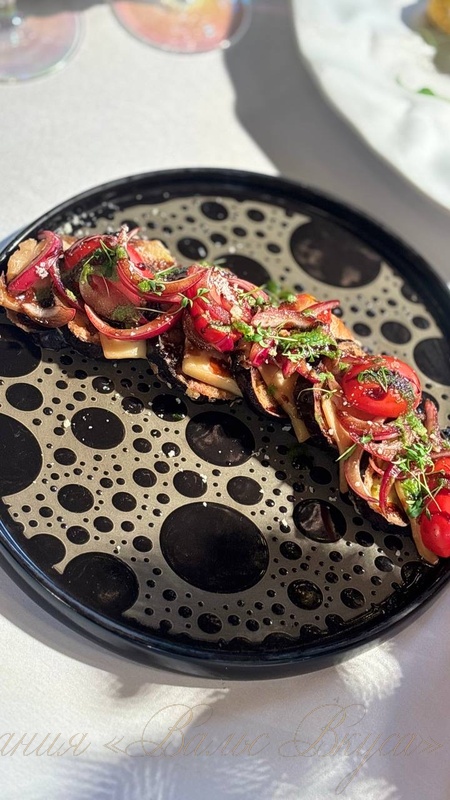 Капрезе из баклажан с маринованным сыром моцарелла и томатами чери, под бальзамической заправкой и пармезановым дрессингом