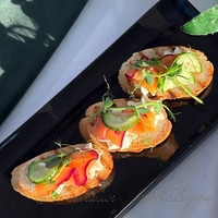 Ассорти брускетт (с лососем с\с и свежим огурчиком, с ростбифом, луковым мармеладом и горчичным соусом; с сыром и печеным перцем; с томатной сальсой)