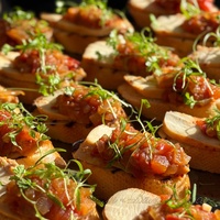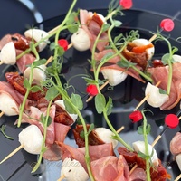 Канапе с запеченным мясом "Витело Тонато" и чери на черном хлебе