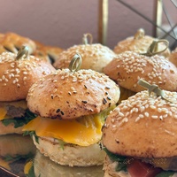 Мини бургер с беконом, говяжьей котлетой, сырным соусом и луком конфи